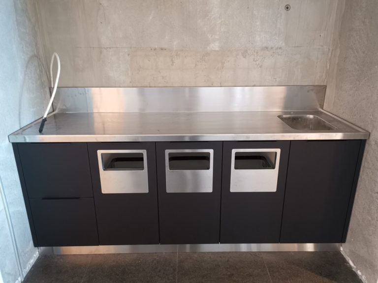 Källsortering i laminat med rostfri toppskiva och utdragbar hållare för avfallspåsar.